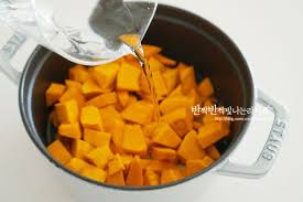 단호박 충분히 익히기, 믹서로 곱게 갈기, 약불에서 계속 저어주기